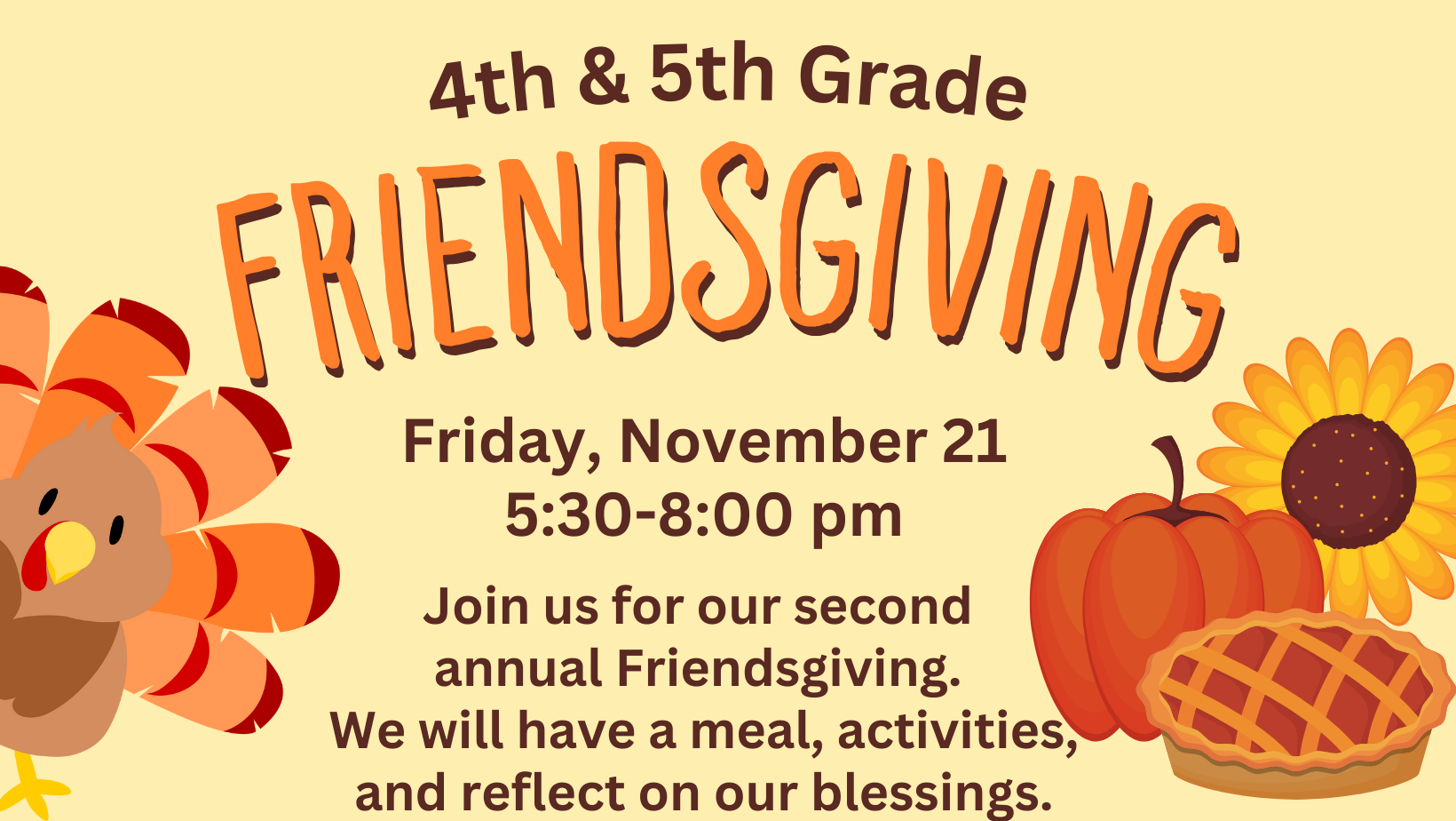 Our 4th & 5th graders are invited our Friendsgiving event. Friends are welcome. You may RSVP and sign-up to bring food below.