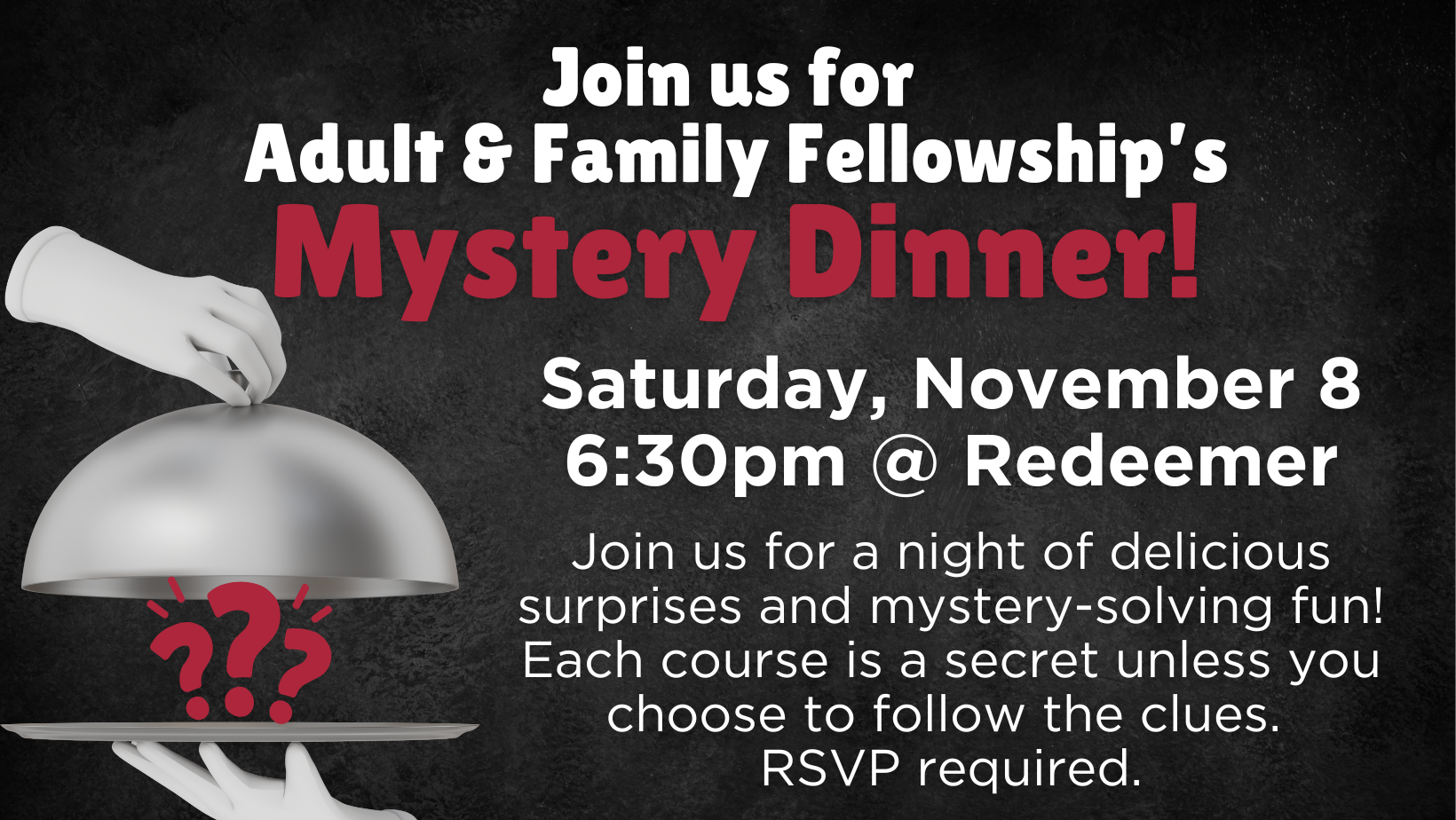 Join us for our first ever mystery dinner! This will be an event you won’t want to miss. Open to all ages. RSVP is required for this event. We will have a free will offering for The Helping Hand and Free Little Pantry.