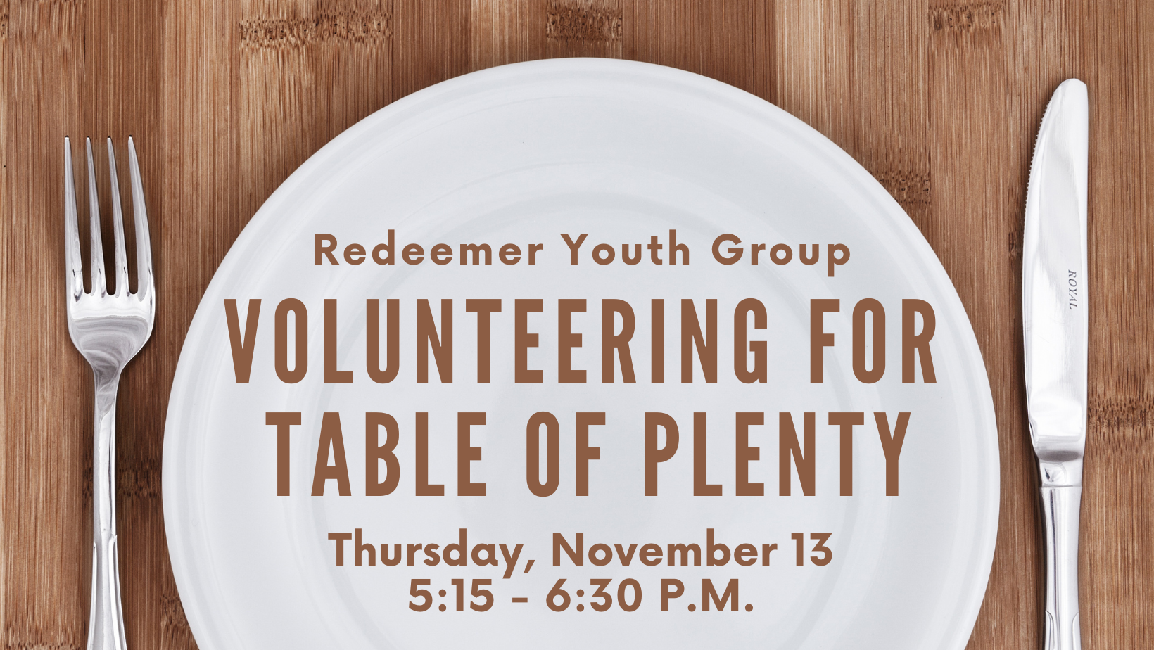 Redeemer’s Youth Group will volunteer to serve meals at Table of Plenty on November 14, 5:15-6:30pm. This is a great opportunity to earn confirmation service hours or silver cord hours while serving your community.